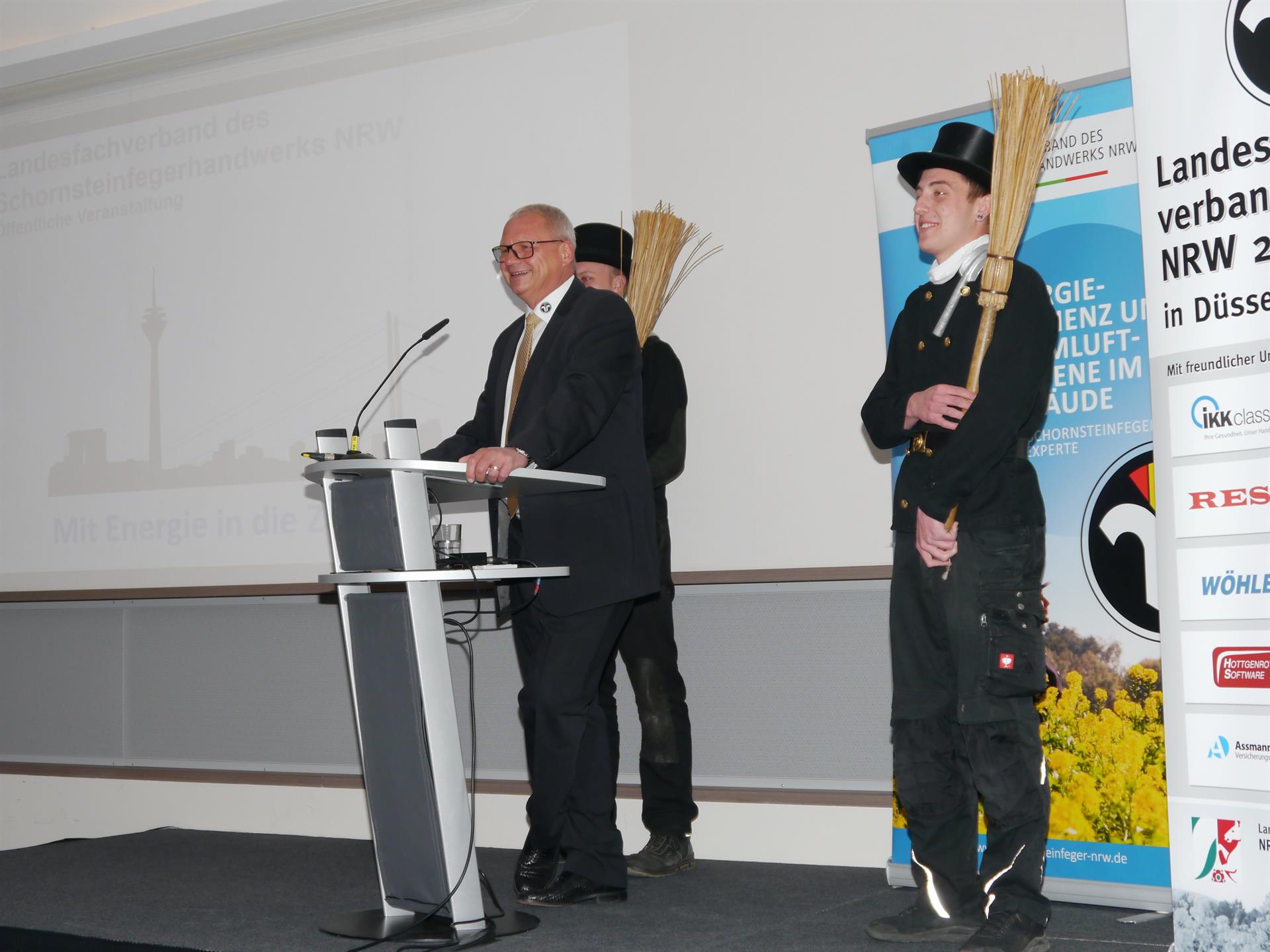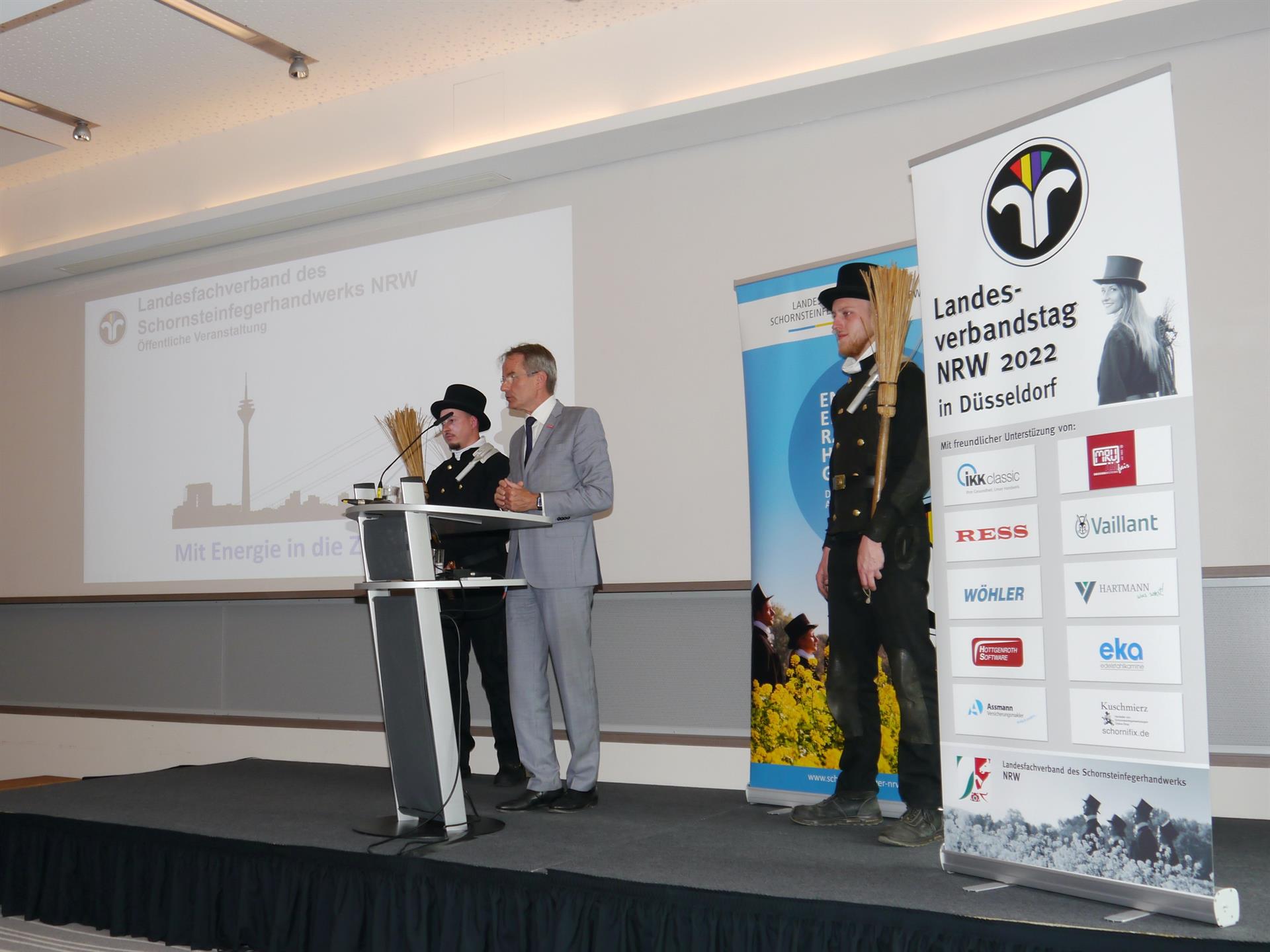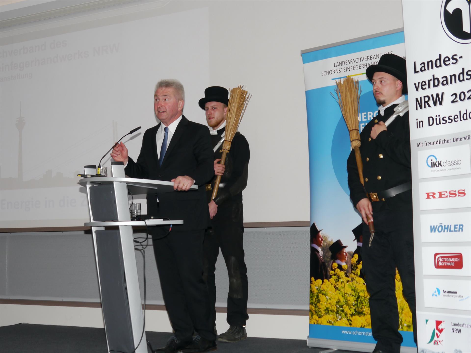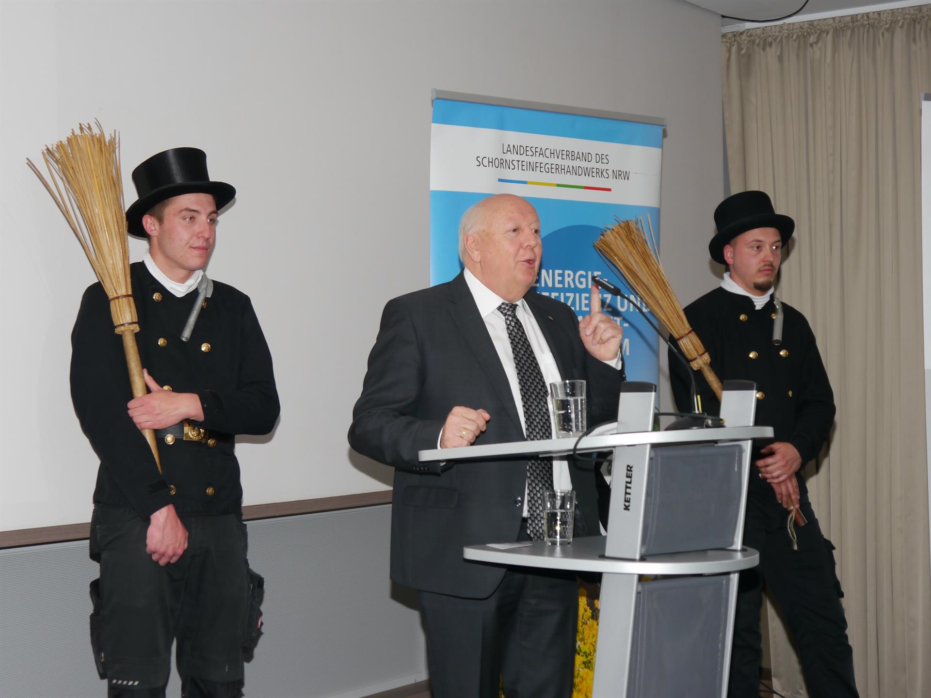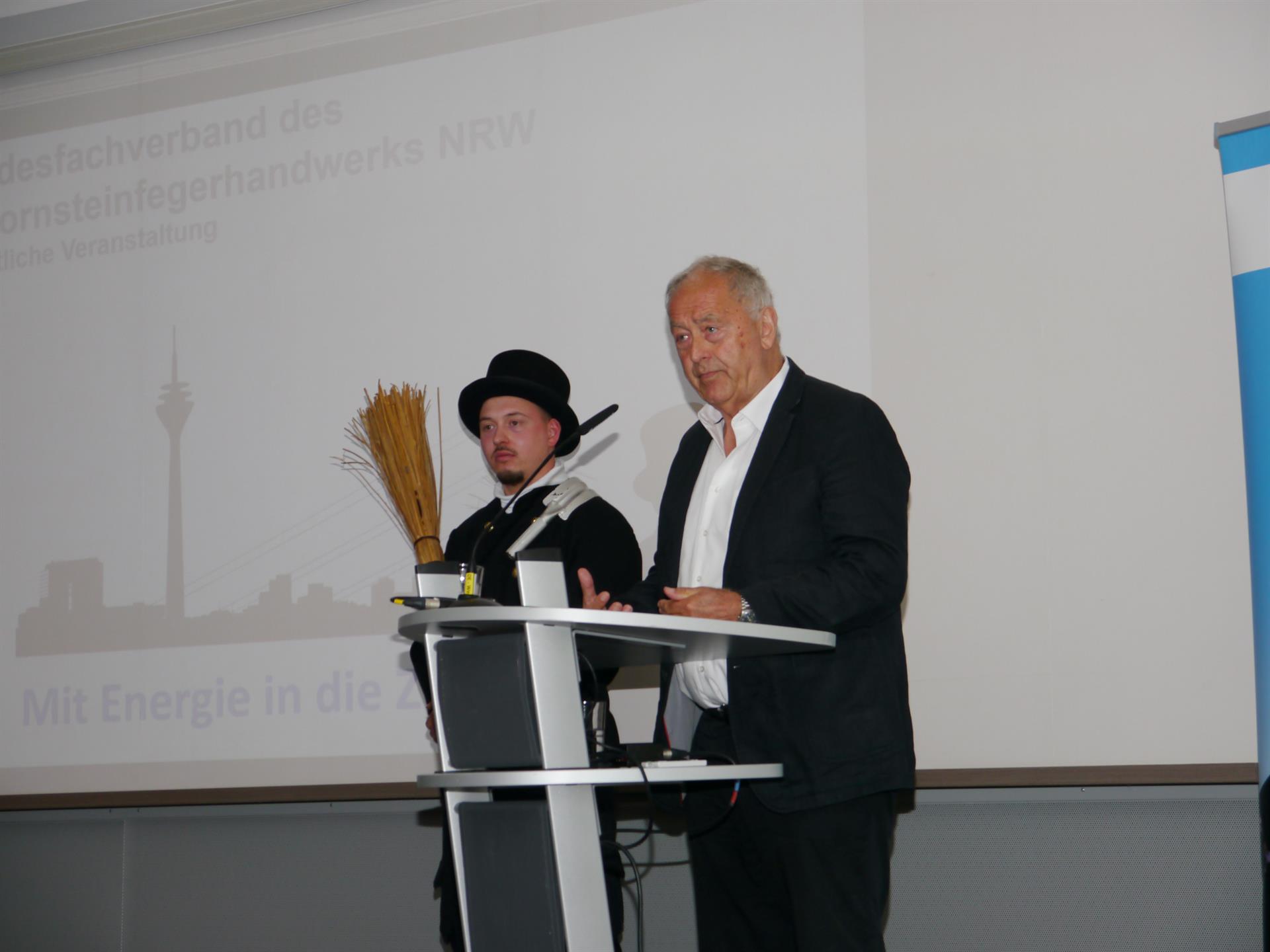 Als einer der zahlreichen Ehrengäste gab sich Prof. Dr. Andreas Pinkwart (FDP) die Ehre, die Festrede des Landesverbandstags zu halten. Pinkwart ist Minister für Wirtschaft, Innovation, Digitalisierung und Energie des Landes Nordrhein-Westfalen und gab einen Überblick über die bisherigen Leistungen des glücksbringenden Gewerks. Viel wichtiger war ihm aber der Ausblick auf die neuen Aufgaben und er bat die Schornsteinfeger bei den Einsparpotentialen in den Gebäuden zu helfen.