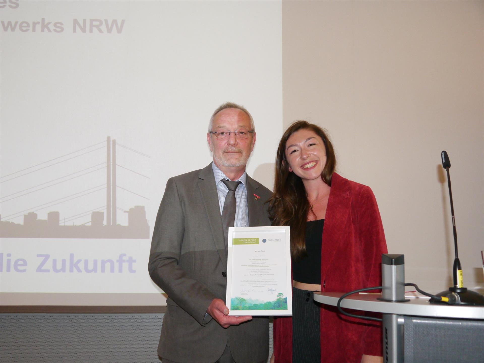 Man hat errechnet, dass jeder Schornsteinfegerbetrieb im Schnitt 5,816 t CO² im Jahr verbraucht. Hierbei geht das meiste CO² auf die Mobilität zurück. Ausgeglichen wird nun die errechnete CO²-Menge durch den Partner Forliance, der mit Frau Astrid Manciu vor Ort vertreten war. Mit den Worten: „Klimaschutz ist Menschenschutz“ übergab die Forliance-Vertreterin symbolisch das Zertifikat zum CO2-Ausgleich seiner Betriebe dem Obermeister Norbert Rieck. Eine Aktion, die hoffentlich noch ganz viele Nachahmer in den Reihen der Schornsteinfeger-Innungen findet.
